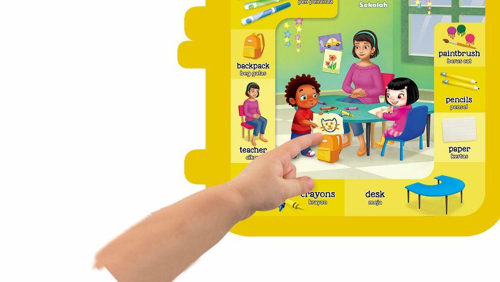 Slide the language switch to learn about places, people and objects in both English and Bahasa Malaysia.