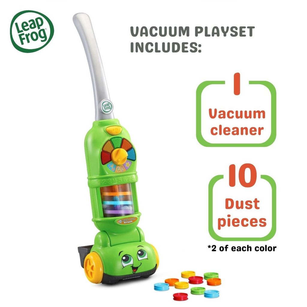 Five light-up panels illuminate to match the color of the piece the vacuum picks up, and the vacuum says the color name and counts the piece to reinforce learning.